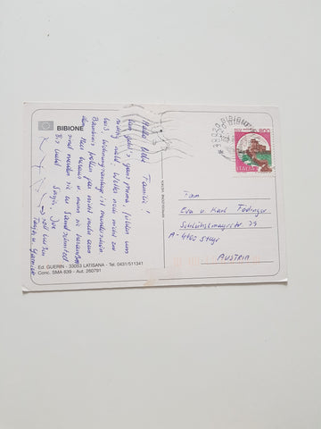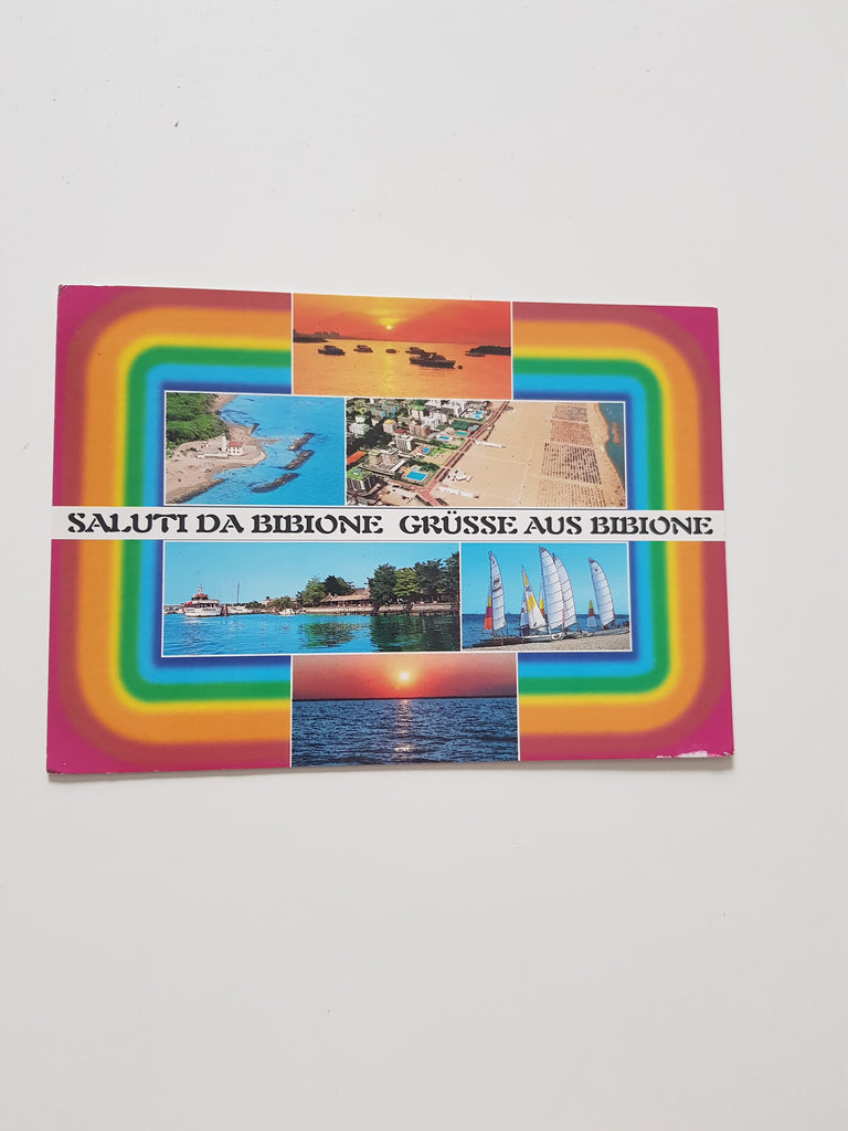 AK Saluti da Bibione. Gelaufen. Großformat. Zustand: linkes oberes Eck geknickt, am unteren Rand etwas berieben, untere Ecken angeknickt.