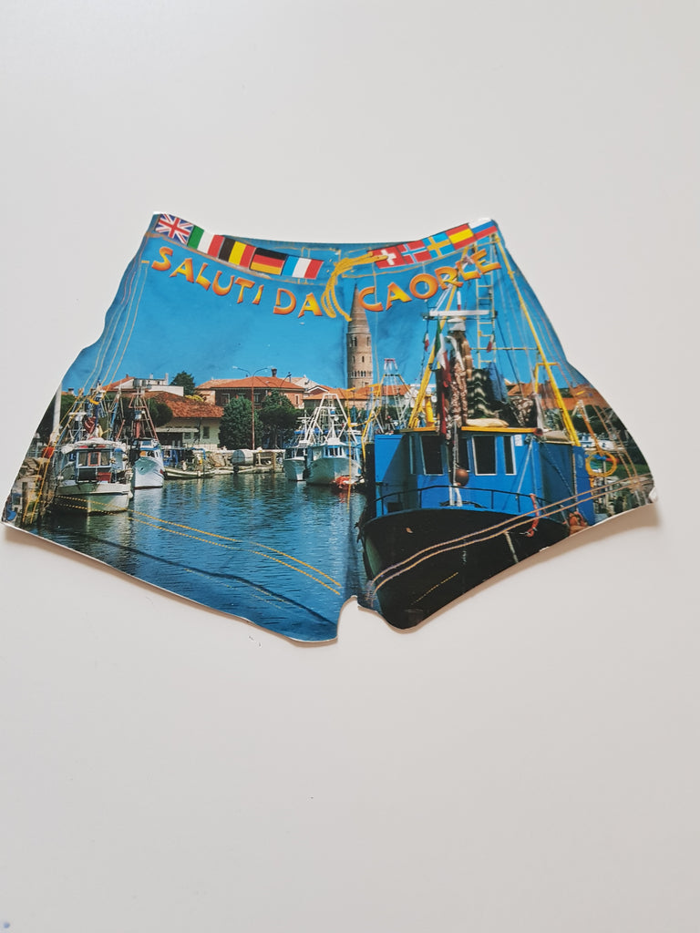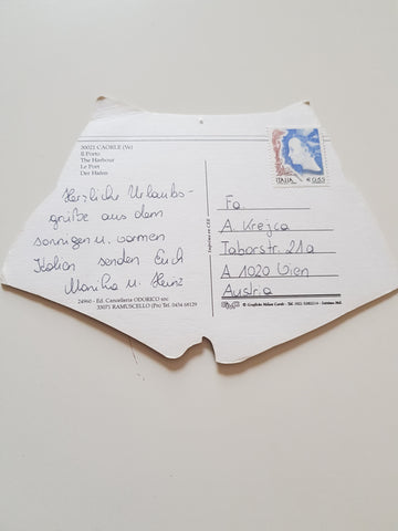 AK Saluti da Caorle. Gelaufen. Sonderformat. Verlag: Odorico. Nummeriert: 24960. Zustand: leichte Knicke, Stecknadeldurchstich oben in Mitte.