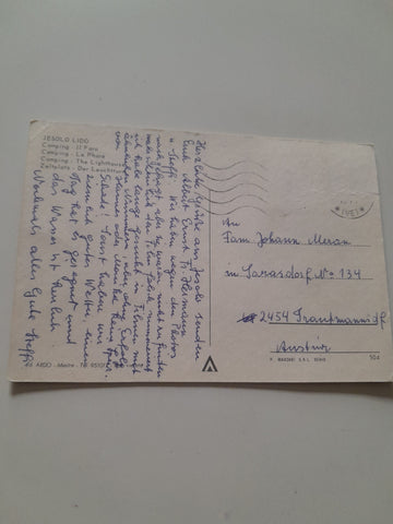AK Jesolo Lido. Camping. Il Faro. Gelaufen, aber Briefmarke wurde entfernt. Großformat. Nummeriert: 504. Zustand: rechtes oberes Eck und am linken Rand geknickt.