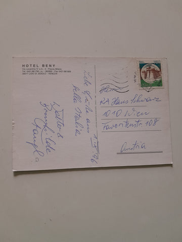 AK Jesolo Lido. Hotel Beny Via Levantina IV, 3 Piazza Milano. Gelaufen. Großformat. Zustand: gut, rechtes unteres Eck geknickt.