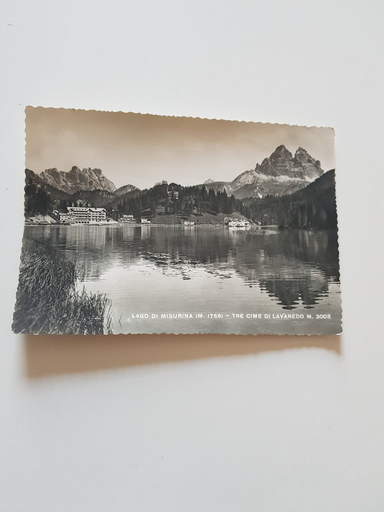 AK Lago di Misurina. Gelaufen, aber Briefmarke wurde entfernt. Großformat. Zustand: Knicke über den rechten Ecken.