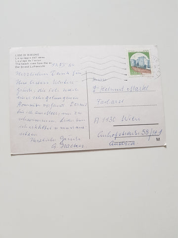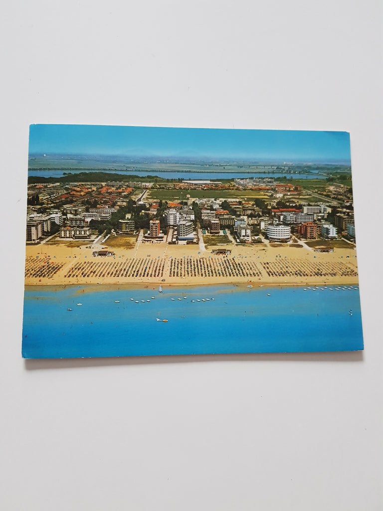 AK Lido di Bibione. La Spiaggia dall'aereo. Gelaufen. Großformat. Zustand: gut, rechtes oberes Eck geknickt.