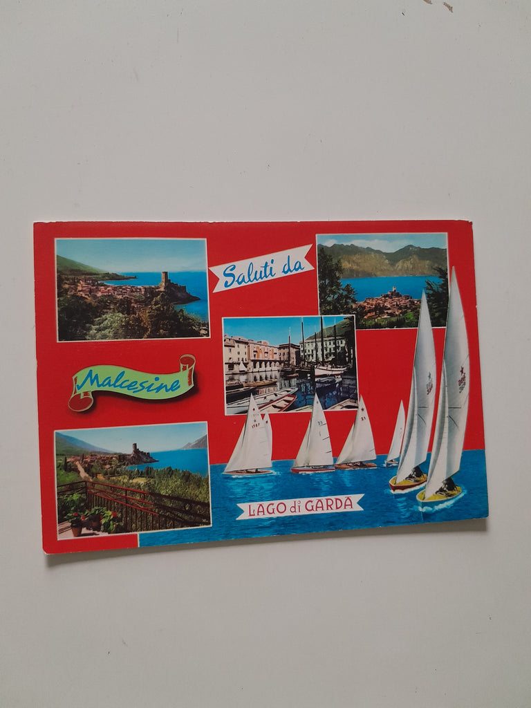 AK Saluti da Malcesine. Lago di Garda. Gelaufen, aber Briefmarke wurde entfernt. Großformat. Nummeriert: 109. Zustand: gut.