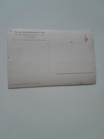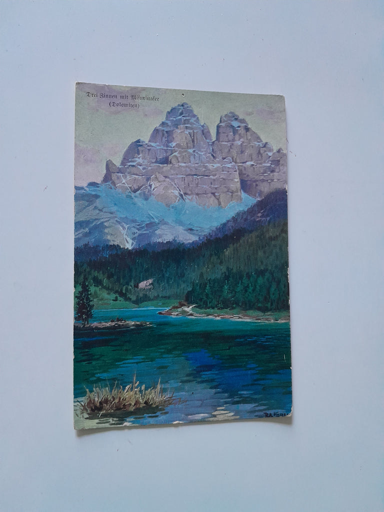 AK Drei Zinnen mit Misurinasee. (nach R. A. Höger) Ungelaufen. Kleinformat. Verlag: Kohler & Co. Bild 20. Zustand: Stecknadeldurchstich am oberen Rand in der Mitte.