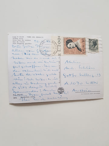 AK Lago di Garda - Torri del Benaco. Veduta aerea. Gelaufen. Großformat. Nummeriert: 3076. Zustand: Knick über der rechten Bildhälfte, linkes oberes Eck geknickt.