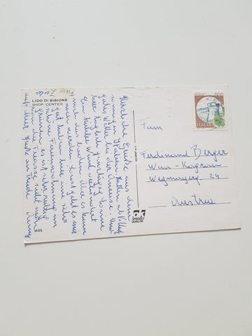 AK Bibione. Shop Center Residence Valbella. Gelaufen. Großformat. Nummeriert: 405. Zustand: gut, linkes oberes Eck angeknickt.