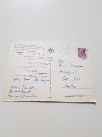 AK Cadini di Misurina. Rifugio F.lli Fonda Savio al Passo dei Tocci. Torre Wundt verso le Tre Cime Lavaredo. Gelaufen. Großformat. Nummeriert: 619. Zustand: gut, obere Ecken angeknickt.