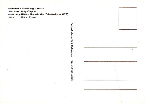 AK Hohenems. Burg Glopper. Älteste Urkunde des Palastarchives. Ruine Altems. Ungelaufen. Großformat. Verlag: WIB. Zustand: gut.