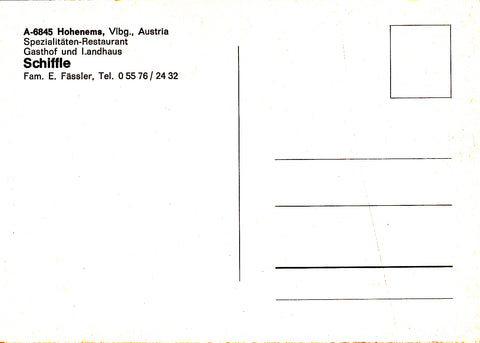 AK Hohenems. Spezialitäten-Restaurant Gasthof und Landhaus Schiffle. Fam. E. Fässler. Ungelaufen. Großformat. Zustand: gut.