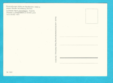 AK Ravensburger Hütte am Spullersee. Lechtaler Alpen. Ungelaufen. Großformat. Verlag: Sedlmayr. Nummeriert: 763. Zustand: linkes oberes und rechtes unteres Eck geknickt.