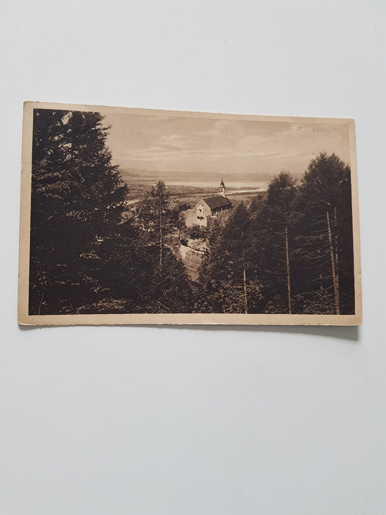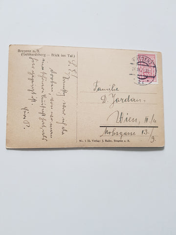 AK Bregenz. Gebhardsberg - Blick ins Tal. Gelaufen. Kleinformat. Verlag: Bader. Nummeriert: 1 32. Zustand: linkes oberes, am oberen Rand und rechtes unteres Eck geknickt.