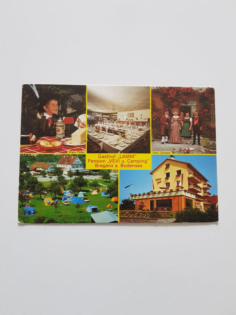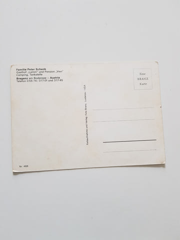 AK Bregenz. Gasthof Lamm. Pension Vevi u. Camping. Gelaufen. Großformat. Verlag: Branz. Nummeriert: 486. Zustand: Ecken angeknickt, leicht fleckig.