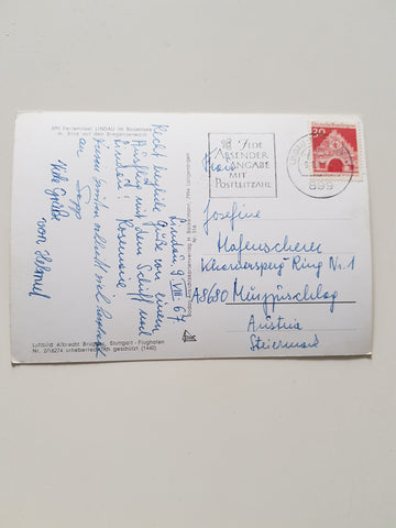 AK Lindau im Bodensee mit Blick auf den Bregenzerwald. Gelaufen. Großformat. Verlag: Bockelmann. Nummeriert: 516. Zustand: obere Ecken angeknickt, Knick unterhalb der Bildmitte.