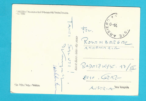 AK Arsiero - Panorama con il Gruppo del Monte Cimone. Gelaufen, aber Briefmarke wurde entfernt. Großformat. Verlag: Fuga. Nummeriert: 68. Zustand: leichte Läsuren.