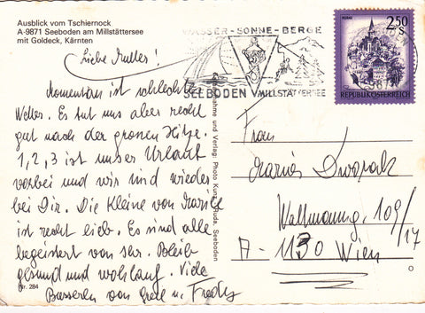 AK Ausblick vom Tschiernock. Seeboden am Millstättersee. Gelaufen. Großformat. Verlag: Kunz. Nummeriert: 284. Zustand: linkes oberes Eck geknickt, Knick über der rechten unteren Hälfte.