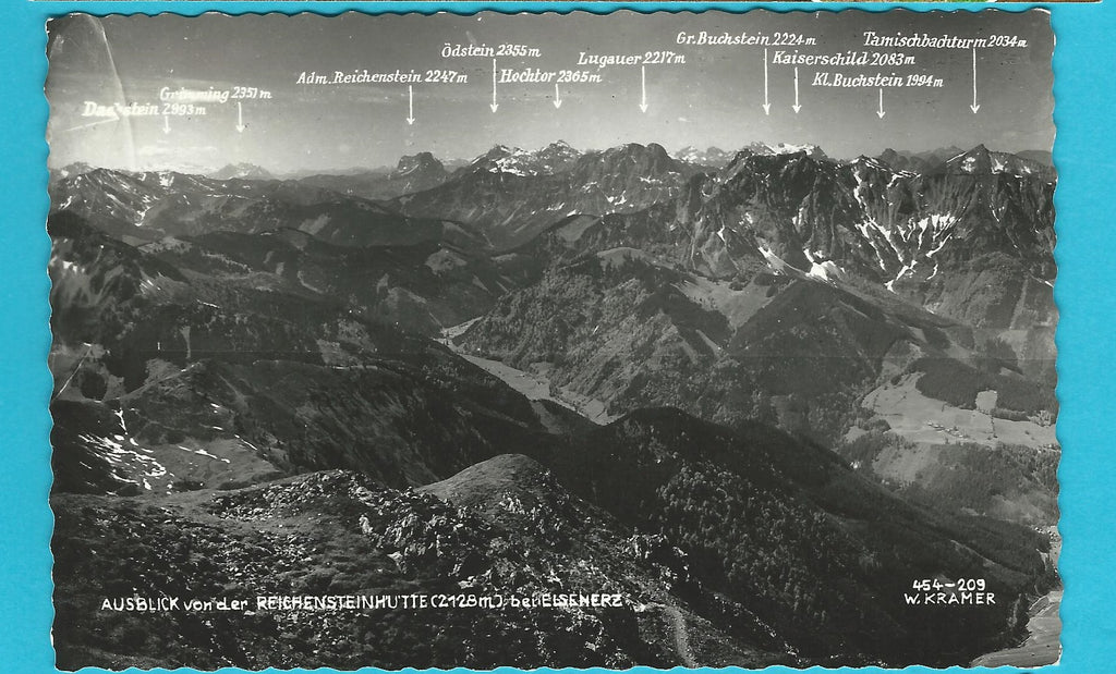 AK Ausblick von der Reichensteinhütte bei Eisenerz. Gelaufen. Kleinformat. Verlag: Kramer. Nummeriert: 454-209. Zustand: gut.