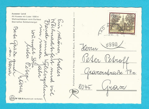 AK Ausseer Land. Altaussee mit Loser. Weihnachtsbaum. Gelaufen. Großformat. Verlag: Rastl. Nummeriert: W 105 A. Zustand: linkes oberes Eck leicht geknickt, sonst O.k.
