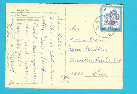 AK Ausseer Land. Bad Aussee. Erzherzog Johann Denkmal im Ausseer Kurpark. Gelaufen. Großformat. Verlag: Rastl. Nummeriert: 816. Zustand: gut, rechtes unteres Eck geknickt.