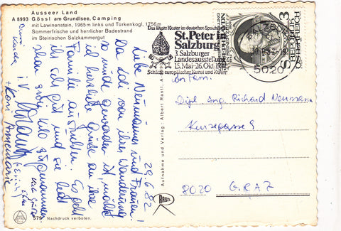 AK Ausseer Land. Gössl am Grundlsee, Camping. Gelaufen 1982. Großformat. Verlag: Rastl. Nummeriert: 579. Zustand: Knick über der rechten unteren Hälfte, am unteren Rand in der linken Hälfte bestoßen.