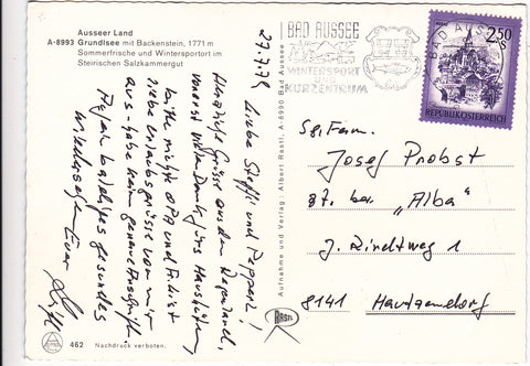 AK Ausseer Land. Grundlsee mit Backenstein. Gelaufen 1979. Großformat. Verlag: Rastl. Nummeriert:462. Zustand: gut, obere Ecken angeknickt.