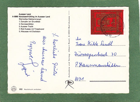 AK Ausseer Land. Narzissenfrühling. Gelaufen 1984. Großformat. Verlag: Rastl. Nummeriert: 812. Zustand: rechtes unteres Eck geknickt, sonst O.k.
