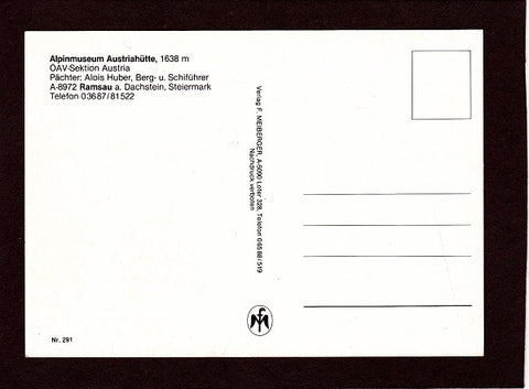 AK Austriahütte. Alpinmuseum. Ramsau a. D. Pächter: Alois Huber. Ungelaufen. Großformat. Verlag: Meiberger. Nummeriert: 291. Zustand: rechtes oberes Eck geknickt, etwas zerkratzt.