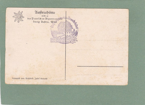 AK Austriahütte in der steirischen Ramsau, oberhalb Schladming. Ungelaufen. Kleinformat. Hüttenstempel. Aquarell von Architekt Josef Kovats. Zustand: an Ecken bestoßen, linkes unteres Eck geknickt, Knick am rechten Rand in der unteren Hälfte.