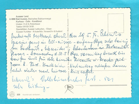 AK Bad Aussee. Ausseer Land. Kurhaus Cafe Konditorei. Lewandofsky. Inhaber: H. & G. Rubenbauer. Gelaufen. Großformat. Verlag: Rastl. Nummeriert: 829. Zustand: gut, linkes unteres Eck geknickt.