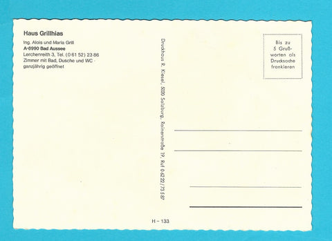 AK Bad Aussee. Haus Grillhias. Ing. Alois und Maria Grill. Lerchenreith 3. Ungelaufen. Großformat. Verlag: Kiesel. Nummeriert: H-133. Zustand: gut.