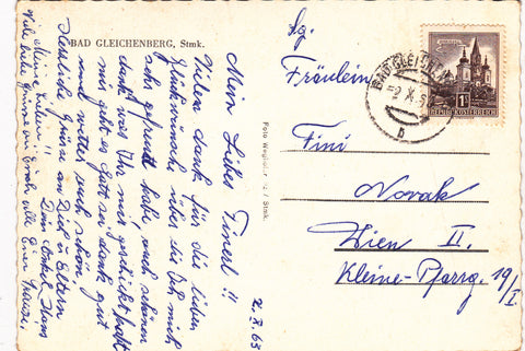 AK Bad Gleichenberg. Gelaufen 1963. Großformat. Verlag: Weghofer. Zustand: stärker fleckig, linkes unteres Eck geknickt.