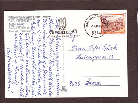 AK Bad Gleichenberg 36. Hotel Zur Emmaquelle Scheer – Tropper. Gasthof Scheer. Haag 15. Gelaufen 1992. Großformat. Verlag: Baumgartner. Nummeriert: 1323. Zustand: gut.