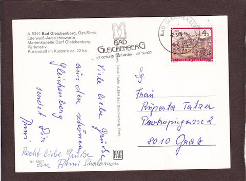AK Bad Gleichenberg. Gelaufen 1989. Großformat. Verlag: Josef Bauer bzw. Pietsch. Nummeriert: 83677. Zustand: gut, linkes unteres Eck geknickt.