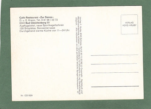 AK Bad Gleichenberg 89, Cafe Restaurant Zur Sonne D. u. E. Krenn. Ungelaufen. Großformat. Verlag: Hruby. Nummeriert: 9324. Zustand: gut, leichte Randläsuren.