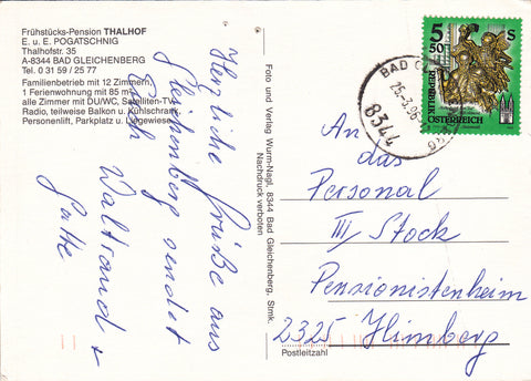 AK Bad Gleichenberg. Frühstücks-Pension Thalhof E. u.E. Pogatschnig. Thalhofstr. 35. Gelaufen. Großformat. Verlag: Wurm. Zustand: stärker bestoßen mit Heftklammerdurchstichen oben am Rand in der Mitte.