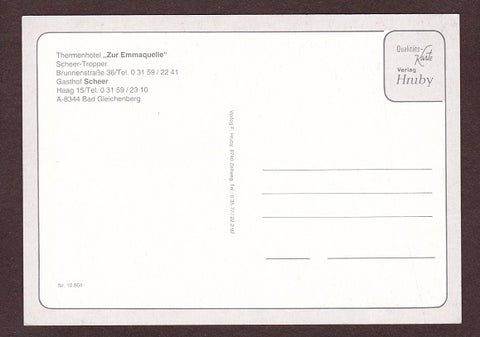 AK Bad Gleichenberg. Gasthof Scheer. Haag 15. Thermenhotel zur Emmaquelle. Scheer-Tropper.Ungelaufen. Großformat. Verlag: Hruby. Nummeriert: 10864. Zustand: linkes unteres Eck geknickt, Knick etwas oberhalb der Bildmitte.