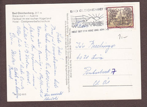 AK Bad Gleichenberg. Hotel – Gastgewerbeschule. Gelaufen. Großformat. Verlag: Hruby. Nummeriert: 6915. Zustand: gut.