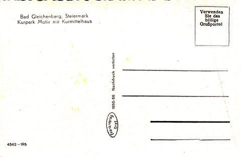 AK Bad Gleichenberg. Kurpark Motiv mit Kurmittelhaus. (1955-56) Ungelaufen. Kleinformat. Verlag: Frank. Nummeriert: 4562-195. Zustand: gut.