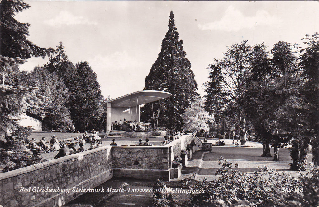 AK Bad Gleichenberg. Musik - Terrasse mit Wellingtonia. Gelaufen. Kleinformat. Verlag: Frank. Nummeriert: 562-158. Zustand: gut.