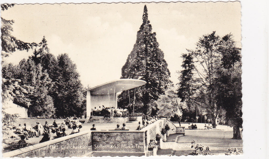 AK Bad Gleichenberg, Musik-Terrasse mit Wellingtonia. (1967) Gelaufen. Kleinformat. Verlag: Frank. Nummeriert: 2562-208. Zustand: Knick über dem rechten oberen Eck bis zum rechten unteren Eck, sonst O.k.