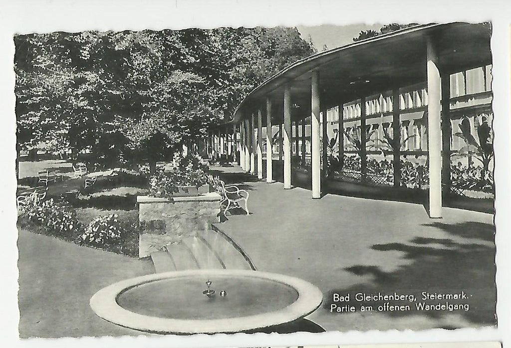 AK Bad Gleichenberg. Partie am offenen Wandelgang. (1960-61) Gelaufen. Kleinformat. Verlag: Frank. Nummeriert: 2562 - 218. Zustand: linkes oberes Eck geknickt, sonst O.k.