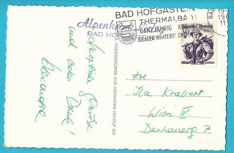 AK Bad Hofgastein. Alpenheim Lieleg. Gelaufen. Kleinformat. Verlag: Wolkersdorfer. Zustand: rechtes oberes Eck geknickt, sonst leichte Läsuren.