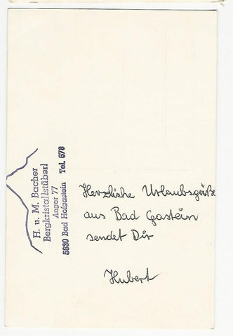 AK Bad Hofgastein. Bergkristallstüberl. H. u. M. Bacher. Anger 77. Ungelaufen. Kleinformat. Zustand: gut, linkes oberes Eck geknickt.