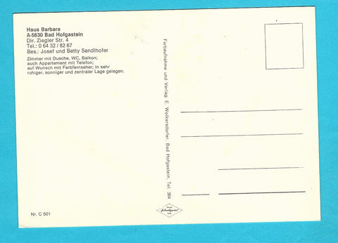 AK Bad Hofgastein. Haus Barbara. Dir. Ziegler Str. 4. Bes.: Josef und Betty Sendlhofer. Ungelaufen. Großformat. Verlag: Wolkersdorfer. Nummeriert: C 501. Zustand: gut, rechtes unteres Eck angeknickt.