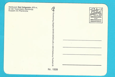 AK Bad Hofgastein. Kurpark mit Pfarrkirche. Ungelaufen. Großformat. Verlag: Cosy. Nummeriert: 1509. Zustand: linkes unteres Eck geknickt.