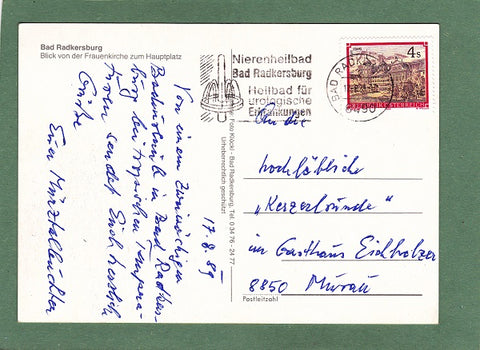 AK Bad Radkersburg. Blick von der Frauenkirche zum Hauptplatz. Gelaufen 1989 in Bad Rdkersburg. Großformat. Verlag: Foto Klöckl. Zustand: Fingerknick in rechter unterer Hälfte, Ecken leicht angestoßen.
