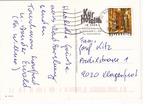 AK Bad Radkersburg. Kurhotel im Park. Gelaufen. Großformat. Verlag: Hruby. Nummeriert: 12219. Zustand: linkes oberes Eck und am linken Rand geknickt.