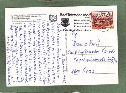 AK Bad Tatzmannsdorf. Gelaufen 1992. Großformat. Verlag: Fasch. Nummeriert: 7431/25. Zustand: rechtes oberes Eck angeknickt, am linken Rand oben etwas bestoßen, sonst O.k.