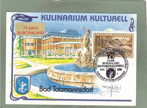 AK Bad Tatzmannsdorf. Kulinarium Kulturell. 75 Jahre Burgenland. Gelaufen 1996, Sonderstempel. Großformat. Zustand: gut.