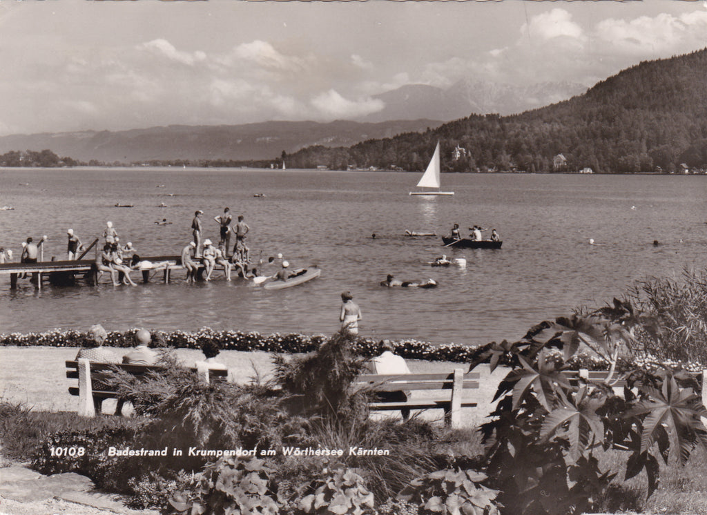 AK Badestrand in Krumpendorf am Wörthersee. Gelaufen. Großformat. Verlag: Rhomberg. Nummeriert: 10108. Zustand: gut, linkes oberes Eck angeknickt.