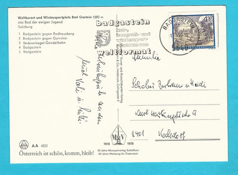 AK Badgastein. Gelaufen. Großformat. Verlag: Monopol. Nummeriert: AA 4222. Zustand: gut, leicht bestoßen.